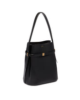Toteme Black Belted Bucket Bag. Crafted in pure black leather. Top handle, belt detail, inner clasp fastening, golden logo embossed on the front, two inner pockets, metallic feet, gold-toned hardware, lined. Size (cm): 21X30X15