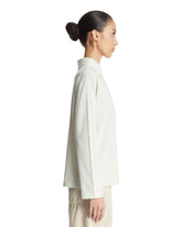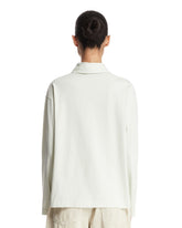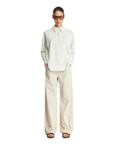 The Row Green Roddie Cotton and Silk Polo. Light green cotton and silk, classic collar, long sleeves, hidden front closure. Straight hem and regular fit. Mariana is 179 cm and she is wearing size S.