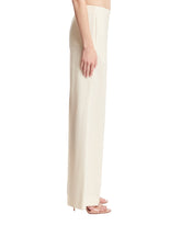 The Row White Foulard Trousers. Crafted in a white wool, silk and linen blend. Invisibile fastening, pressed crease, two side on-seam pockets, back welt pocket, slightly flared leg, straight hem. Greeta is 172 cm and she is wearing size 4.