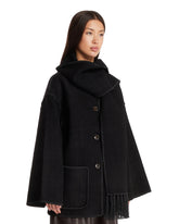 Toteme Black Wool Scarf Jacket. Black wool blend, integrated scarf embroidered along the edges, long sleeves, dropped shoulders, patch pockets, front button closure, tone-on-tone decorative embroidery. Isla is 176 cm and she is wearing size 36.