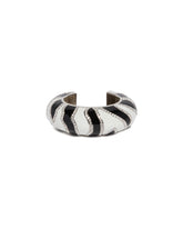 Jacquemus Zebra Bracelet. Silver-plated brass, rigid design, bi-color enamel zebra pattern, inlaid rhinestones, engraved logo.