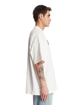 Fear Of God White Printed T-Shirt. White cotton, crew neck, short sleeves, dropped shoulders, front print with lettering, iconic logo tag on the back, oversized silhouette, straight hem. Leandro is 187 cm and he is wearing size M.