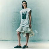 In her new creative chapter, Chitose Abe celebrates twenty-five years of creative innovation by returning to sartorial clarity, yet through the lens of Sacai’s signature fusion and surprise. The men’s collection is a clear homage to James Dean in Rebel Without a Cause, offering a dialogue that delves into the concept of freedom. Abe reinterprets the codes of 1950s fashion with a contemporary and fluid approach, expanding volumes, deconstructing and reconstructing, while incorporating architectural details into outerwear. The women’s collection tells a story of refinement and deconstruction: classic outerwear is paired with couture-like details, knitwear experiments with textures and colors, while evening attire remains formal yet unconventional.