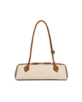 Alaia Beige Medium Le Teckel Bag. Brown suede, beige canvas, elongated shape with suede tubular handles and two decorative laces. Double zip closure, removable mirror inside the pocket. Fully lined, logo detail, gold-tone hardware. Size (cm): 32X10X10