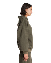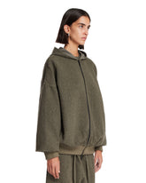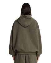 Fear Of God Green Zip-Up Sweatshirt. Green wool, cotton, and technical fabric blend. Hood with drawstrings, long sleeves, ribbed hem and cuffs, kangaroo pocket at the front, iconic logo patch on the back, oversized silhouette, straight hem. Anna is 178 cm and she is wearing a size S.