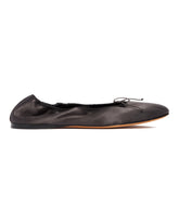The Row Black Awar Leather Ballet Flats. Black leather upper, oval toe, grosgrain trim and adjustable elastic tie. Leather sole and leather lining.