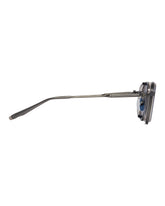Akoni Gray Eclipse Sunglasses. Japanese titanium with light blue tinted lenses, custom ribbed round titanium temples with round textured detail and personalized tips. Acetate details, titanium-coated ceramic nose pads, branded accents, gold-tone hardware.