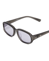 Gentle Monster Gray Rna GC9 Glasses. Translucent gray acetate frame, Temples featuring the Bold Collection's signature symbol. Violet lenses and square shape.