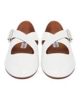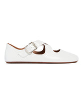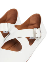 Alaia White Criss Cross Ballet Flats. Upper crafted in pure white leather. Design inspired by classical Japanese shoes, criss cross upper straps with buckle and elasticated insert, logoed insole, rubber outsole.