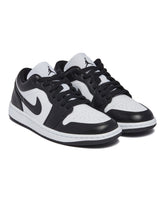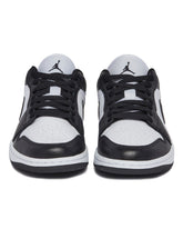 Nike Black Jordan 1 Low Sneakers. Upper crafted in pure white and black leather. Round toe, front lace-up fastening, perforated details, Nike swoosh on the side, Air Jordan logo details, flat rubber outsole, lined.
