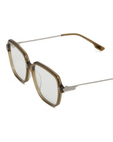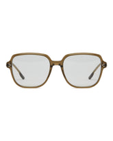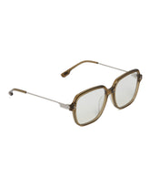 Occhiali Verdi Mua KC1 di Gentle Monster. Montatura in acetato verde kaki traslucido, lenti trasparenti anti luce blu. Forma quadrata. Astine tono su tono caratterizzate dall'iconico dettaglio in metallo della Collezione Gentle Monster 2023.