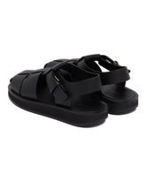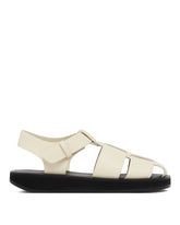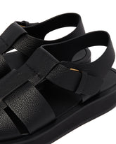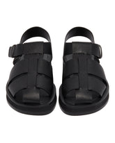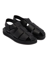 Sandali Fisherman Neri di The Row. Tomaia in pura pelle nera. Punta squadrata, cinturini senza cuciture, fibbia regolabile nascosa, suola in gomma.